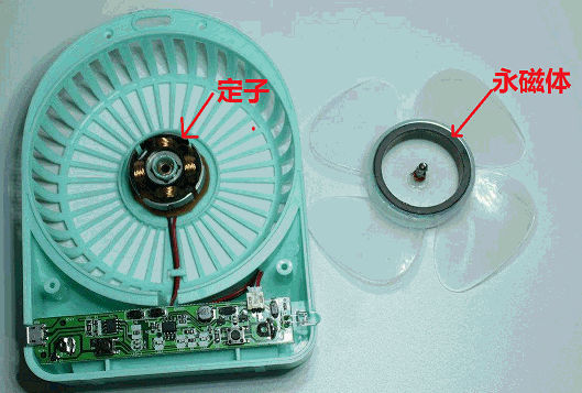 2.單相直流無刷電機原理是:同極相斥,異極相吸。這兩個磁極是通過電磁鐵(定子)和永磁鐵(轉子)來形成,所謂電磁鐵就是通電就會有磁場產生,在單相電機里面,也就是定子(不動的部分),如下圖所示,是漆包線繞在硅鋼片上。而永磁鐵則貼在扇葉(轉子)上。