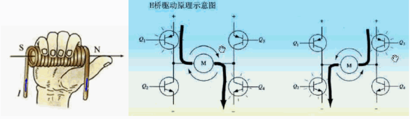 3.有了前面的感官認知,方便后續講解,希望大家不要嫌棄羅嗦,畢竟每個人的情況不一樣,我們要盡可能多的照顧更多的人,其實單相電機控制--就是利用H橋(4個MOSFET)來控制電磁鐵(定子)磁場。根據右手螺旋定則可知,不同的電流方向,會得到不同的磁場極。利用H橋來實現電流換相,最終得到不同的磁極,從而達到同極相斥,異極相吸的目的,如下圖所示:當Q1Q4導通時,電流從左向右流動;當Q2Q3導通時,電流從右向左流動。